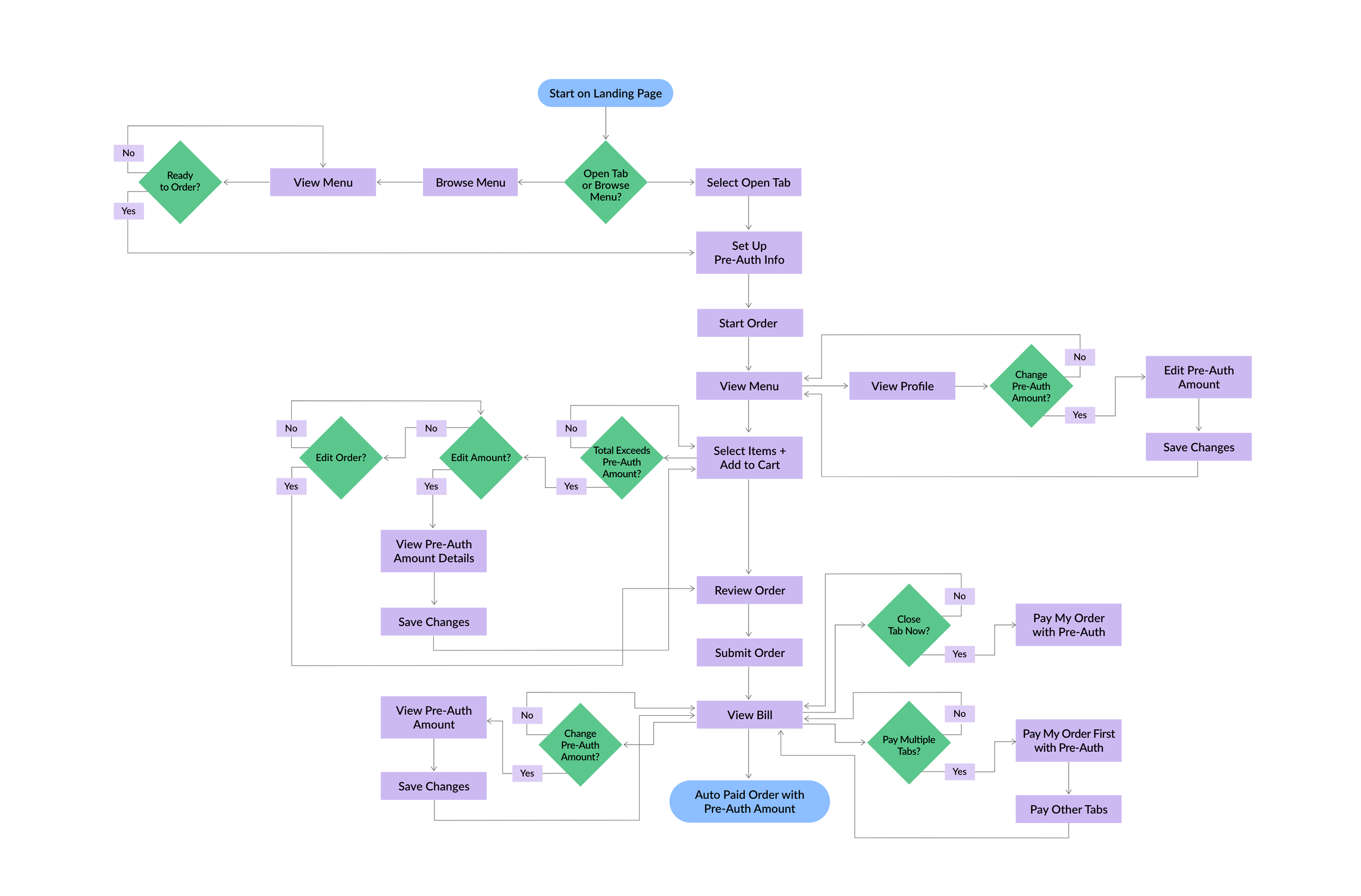 During initial research into pre-authorization in the restaurant and app industry many users reported that the process can often be complex. Traditional methods of pre-authorization at many pubs and bars were to take a customers credit or debit card and hold it until they were ready to settle their tab. Many apps require users to create accounts that would live exclusively in that app that may or may not be used again. Often times, similar to filling up at the gas station, pre-authorization amounts were often well above the cost of the actual item and took too long to clear from a user’s account. Some users also were not comfortable with placing credit card information online due to security risks.